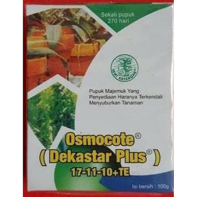 Pupuk Slow Release Daun DEKASTAR 17-11-10 Plus.Isi kemasan = 100 g, dalam bentuk butiran.Kandungan: 17% N, 11% P2O5, 10% K2O, 2% MgOdan hara mikro lainnya yaitu B, Cu, Mn, Mo, dan Zn.Sekali pupuk: 270