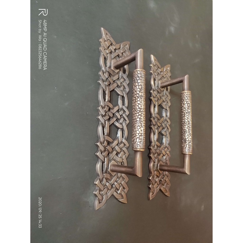 Bahan kuninganFinishing antikukuran Panjang 25 cm dan lebar 5,5 cm dan tinggi 6 cmUntuk pembelian item ini,agan menerima 1 set /sepasang / 2 pcs handle pintu motif tali ukir Pull.Silahkan klik tombol BELI untuk bertransaksi, shopee transaksi online aman,nyaman dan terpercaya. DI JAMIN 100 %Jika ada yang mau di tanyakan jangan sungkan untuk mengontak kami.tqSTOCK Untuk menghindari refund (pengembalian dana), mohon sebelum melakukan pemesanan, silahkan hubungi kami terlebih daluhu untuk memastikan Stock Produk tersedia. Cara menanyakan Stock, bisa melalui Tinggalkan Pesan pada produk yang Anda maksud.PACKING &PENGIRIMAN Pengiriman dengan packing kardus tebal dan diberi gumpalan kertas koran bekas, tahan goncangan, sehingga aman sampai tujuan. Pengiriman dilakukan setiap hari, kecuali tanggal Merah pada Kalender. Khusus hari Sabtu, pengiriman hanya dilakukan pada pagi hari, jadi Orderan yang masuk hari Sabtu setelah jam 9 pagi, akan dikirim pada hari Senin (hari Minggu agen JNE tutup). Kami hanya mengunakan JNE untuk pengiriman. Jika Anda memilih JNE layanan YES (Yakin Esok Sampai), belum tentu barang yang Anda pesan sampai ke alamat tujuan dalam waktu 1 hari. Jika Orderan masuk ke kami sore/malam hari, tentu kami kirim keesokan harinya. Jika barang yang diorder masih proses produksi, kami akan segera kirim &respon orderan Anda secepa