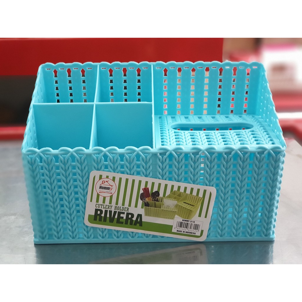 Tempat Sendok Rivera Hommy 3110/Tempat Tissue Rivera/Tempat Sendok Tissue Rivera*(Model Anyaman)* berbahan tebal & food grade* bisa digunakan sebagai tempat sendok ataupun tempat kosmetik.* mempunyai alas rapat (tertutup)* Tersedia warna: biru, pink & hijau* Dimensi Produk: P23 x L10,7 x T10 (tinggi sisi depan) x T15cm (tinggi sisi bela
