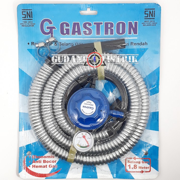 Gas Paket Gastron (selang+Regulator Gas)Selang gas dengan standart SNIDilengkapi dengan indikator penanda volume gas yang masih tersisa di dalamtabungDilengkapi dengan pemutus aliran gas pada saat gas bocor pengatur secaraotomatis memutuskan aliran gas di dalam selangterdiri dari 2 lapisan : lapisan dalam terbuat dari karet & lapisan luar terbuatdari bahan alum