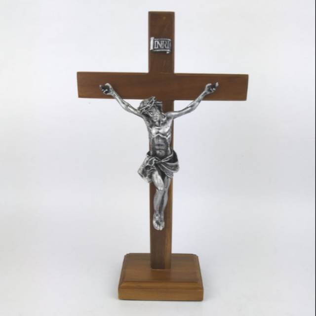 Name: Salib Duduk Altar Meja Doa Ibadah Kayu Corpus Yesus Inri 30 Cm Fiberglass Warna Silver Arca Rohani
