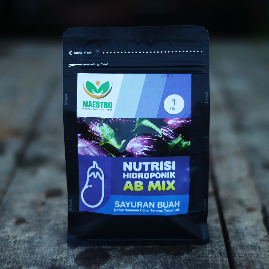 Nutrisi Hidroponik AB Mix Sayuran Buah 1 Liter, Merk MAESTROMengapa harus menggunakan produk Maestro?1. Diracik dari bahan-bahan berkualitas sehingga hasilnya luar biasa.2. Komposisi racikan Nutrisi MAESTRO sudah diuji di kebun skala industri3. Dikemas menggunakan Aluminium Foil sehingga tidak lembab dan tidak tembus sinar matahari.4. Kemasan sangat kuat sehingga aman saat dikirim menggunakan Jasa Pengiriman5. Praktis dan mudah cara penggunaannya.Detail Produk:- 1 Set nutrisi terdiri dari kemasan A dan kemasan B.- 1 Set nutrisi dapat digunakan untuk 200 Liter air bersih- Nutrisi ini bisa diaplikasikan untuk tanaman sayuran Buah seperti: Cabe, Tomat, Terong, Timun, dllNB:- Berikut juga kami sertakan video tutorial penggunaan larutan nutrisi AB Mix- Petunjuk pemakaian ada di dalam kem